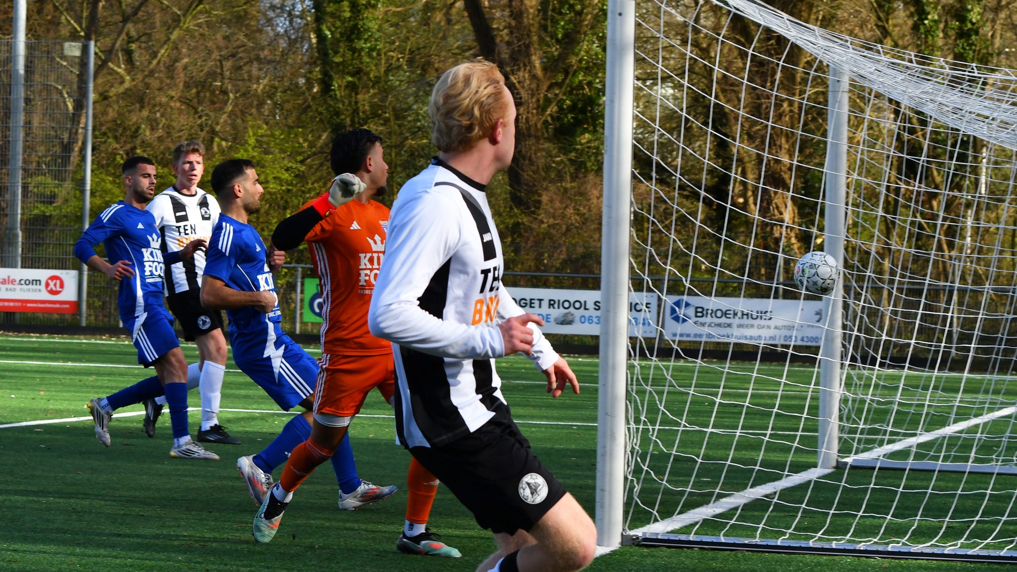 Enter Vooruit startte overigens niet slecht, leek al rap controle gevonden te hebben, maar de Enschedeërs hadden toch het betere van het veldspel en bekroonden een langzaam opgebouwde veldmeerderheid al rap met een doelpuntenbonus. Yannik de Vries vond aan de linkerkant de opening en zijn voorzet werd door middenvelder Sharbel Abouzeid met een harde schuiver gepromoveerd naar de 1-0. Verder gaf Enter Vooruit achterin dus weinig weg, maar kwam aanvallend ook (te) weinig piepen voor de Enschedese kooi. Tóch noteerde zwart en wit de grootste kans op een treffer in die eerste helft, nog vóórdat de 1-0 op het bord kwam. Niek Welink snelde op links alles en iedereen uit z’n wiel, maar de ronde knikker werd na z’n uitstekende voorzet bij de tweede paal door Job Voortman, vanaf drie meter tegen de paal tegen de paal geduwd. Een duur missertje zou dus verderop blijken.