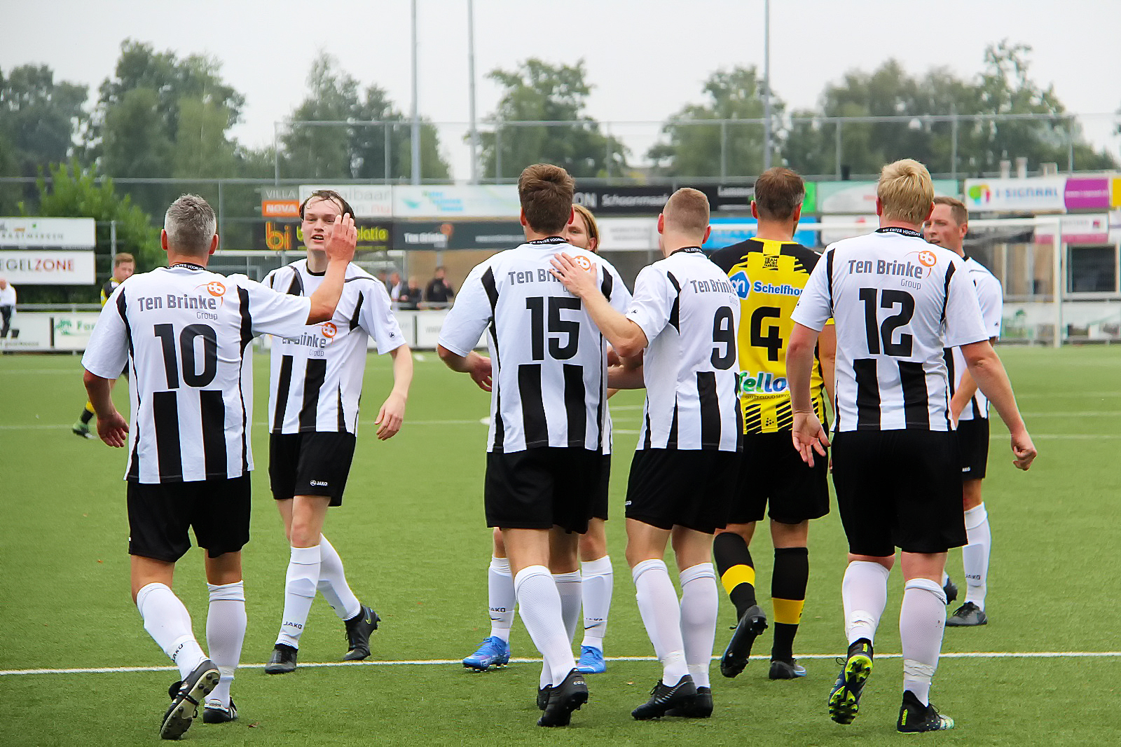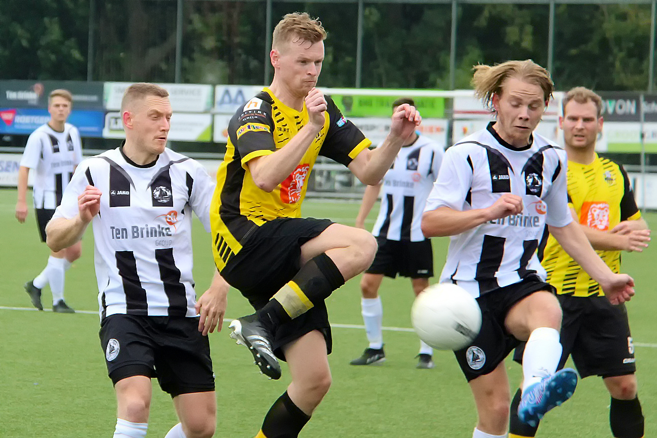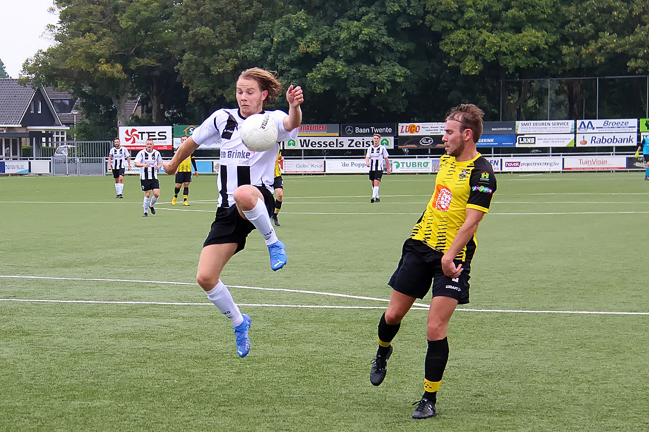 Wellicht dat zoveel voorspoed, met daaraan gepaard een lichte overmoed in de Enterse koppen ging zitten, want ondanks die 4-0 in de achterzak leek de formatie van Hodes nog geenszins ontmoedigd door dit weinig fraaie tussenrapport en trok nog voor de pauze het laken steeds meer naar zich toe. En toen de oefenmeester der Almeloërs tijdens het schaftkwartier hernieuwde instructies voor zijn manschappen had uitgetekend, kregen de geel-zwarten direct na de koffie- en theepauze twee dotten van kansen, die (gelukkig voor de thuisploeg) beiden verkwanseld werden. Was dit twee keer raak geweest, dan had zwart en wit nog geenszins de horlepiep kunnen dansen. Rond het Enterse onderkomen, waar trainers en wisselspelers horen te verblijven tijdens de match, beende E.V.-coach Jan Willem van Holland, als door een wesp gestoken heen en weer (de oefenmeester zat toch al nauwelijks op zijn zeteltje gedurende de 90 voetbalminuten) en maande zijn krijgers driftig en veelal luidkeels tot meer alertheid. Die boodschap kwam over. Achterin liet de Enterse defensie er geen muis meer door, het middenveld danste als stekende horzels rond hun tegenstrevers zodra die een bal kregen aangespeeld en voorin pakte E.V. de draad van de doelpuntenproductie weer op en voetbalde zich vervolgens naar een zevenklapper. Wout Velten kopte E.V. na een magistraal genomen vrije schop van de ijzersterk acterende jeugdspeler Dirk Bretveld, uiterst fraai naar de 5-0, Marco ter Weel (na nog geen 20 speelminuten ingevallen voor de geblesseerde Job Voortman) kogelde nummer zes binnen en Sander Jansen mocht de bal mee naar huis nemen toen hij zijn derde en E.V.’s zevende treffer tegen de touwen liet bollen. Tussendoor lieten invallers Jorn Nijkamp en Peter van Brussel ook nog een wijle zien dat ze uit het goede voetbalhout gesneden zijn. Als Jan Willem van Holland op deze zonnige zaterdagmiddag, voor zijn dug-out een hoed had gedragen, zou hij die met een zwierige zwaai hebben afgenomen voor zijn troepen. Nu was Van Holland na afloop rap weer bij de alledaagse realiteit, omdat ie maar al te goed weet dat één zwaluw nog geenszins een wolkeloze zomer maakt en dat tijdelijk succes een week later zomaar kan omslaan in een nuchtere ontgoocheling.